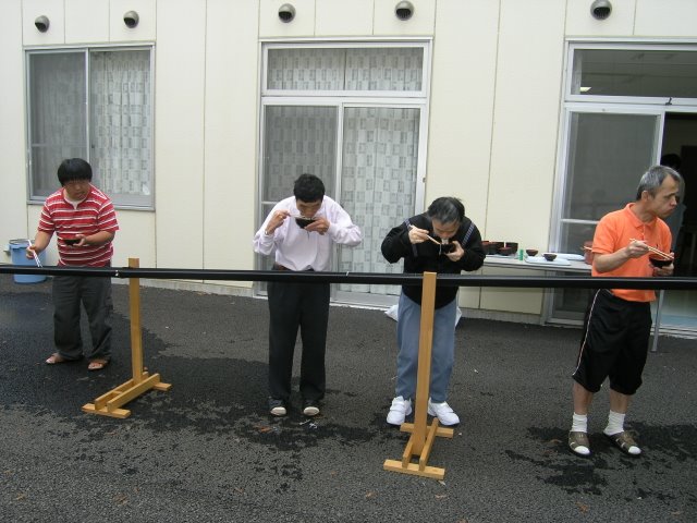 悠久の杜も、先日の真夏日に涼を感じてもらえるよう、中庭で昼食に「流しそうめん」をいたしました。