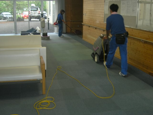 それで、開設当初の輝きを取り戻そうと、今回全館の廊下とフロアーのワックス掛けを専門業者にお願いしました。