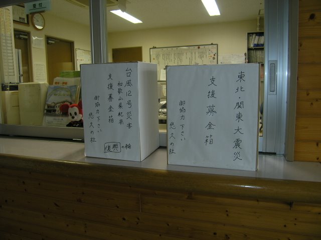 施設事務所受付前に紀南地方支援募金箱を設置しました。