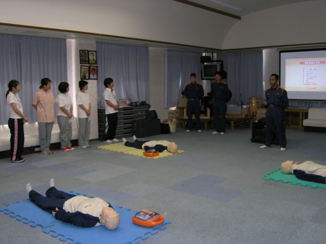 悠久の杜では今年度も職員の新規採用を複数名しましたので、地元消防署より職員の派遣をお願いし心肺蘇生法、AEDの取扱方法について学びました。