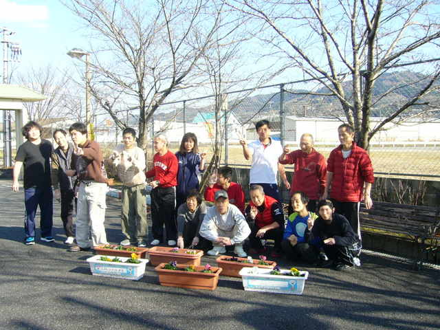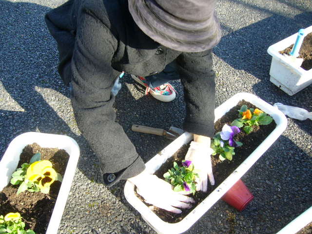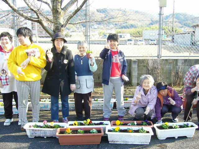 今回はパンジーを32個のプランターと花壇に植えました。温かい日差しを受けて花も綺麗に咲いていますが、利用者さんも綺麗に咲かそうと丁寧に植えた努力の汗も光っています。