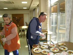 今日は、そのお礼に男性利用者さんがホットケーキを焼いて、きれいに飾り付けをしてプレゼントしました。