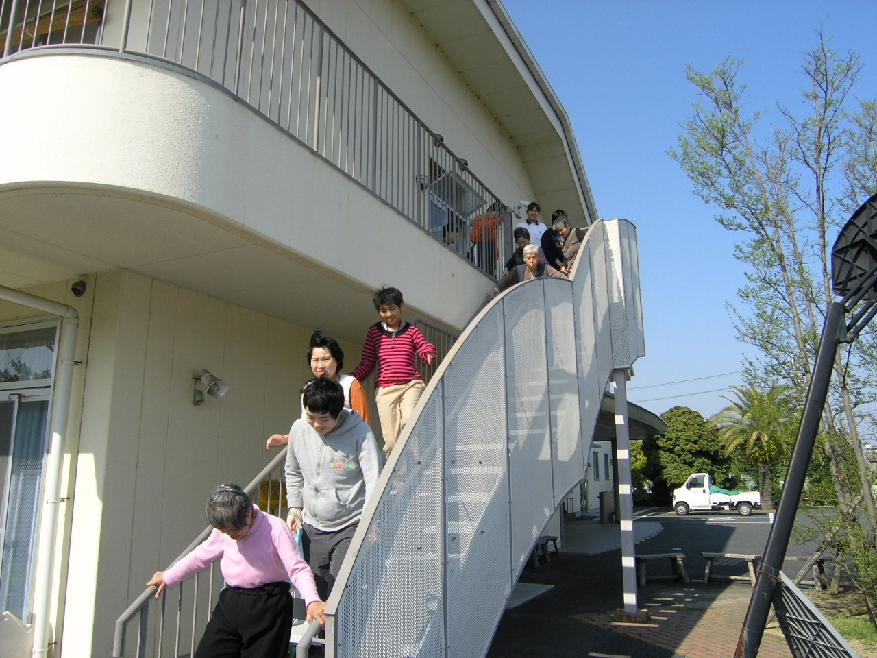 入所の当初は素早く避難できなかった利用者さんも訓練を重ね、落ち着いて早く、お互いに気にしながら避難ができるようになっています。