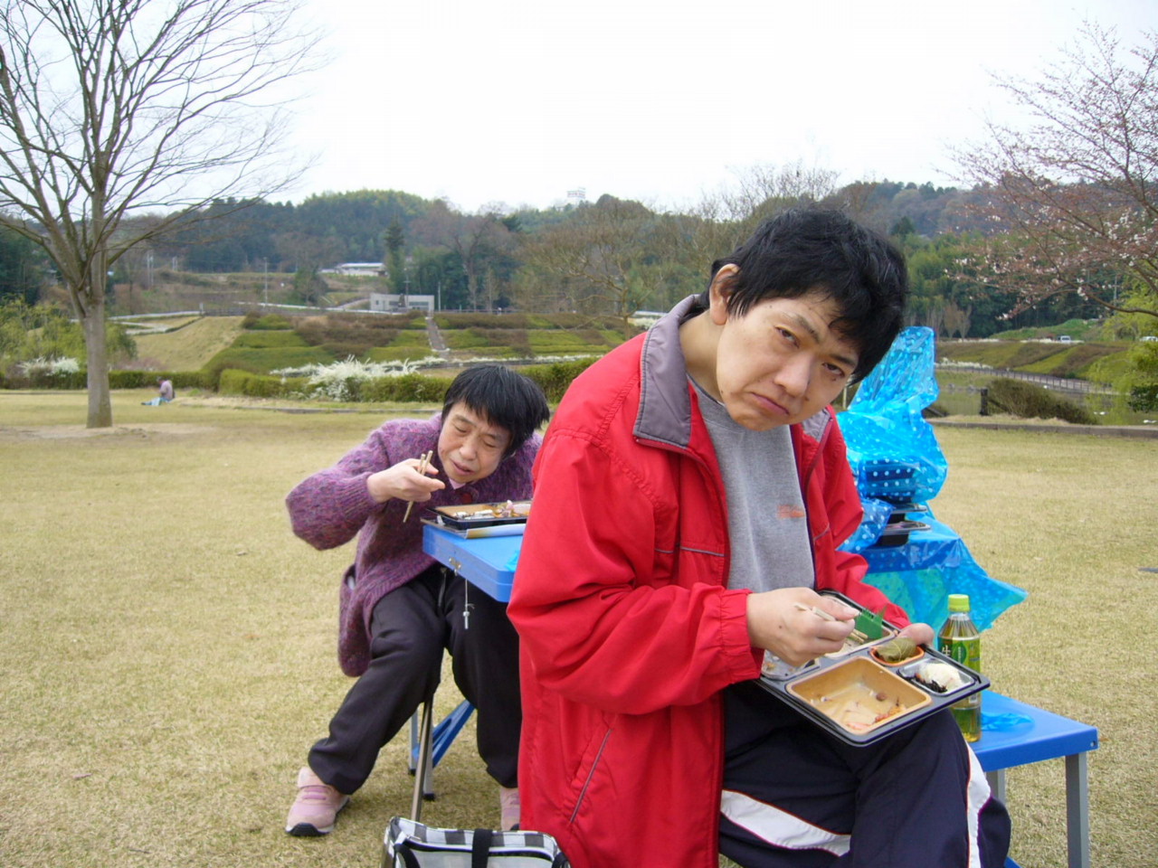 写真左から1.まだ桜がちらほらでした 2.お弁当美味しいよ 3.職員の方が楽しそう?