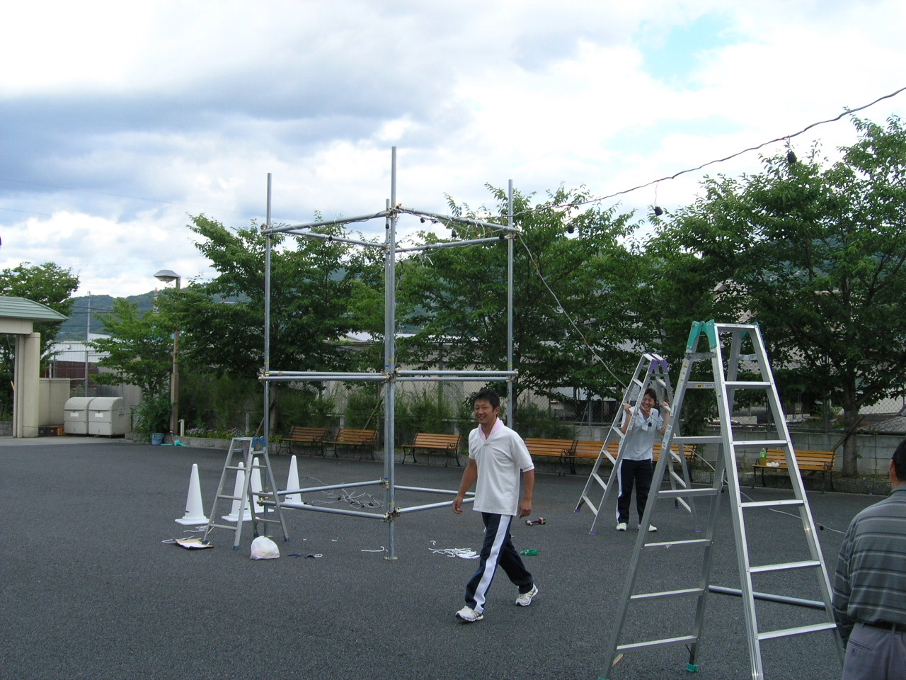 昨日は盆踊り大会のメイン会場となります施設玄関前に櫓を組み立て、提灯の配線を行いました。