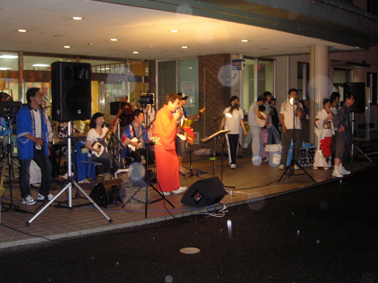 MYCのバンドの皆様のリハーサルが始まり、そして周りの景色が薄暗くなってきて提灯に灯が入ると、いよいよ盆踊りが始まるのかと利用者さんも玄関前に集まってきました。