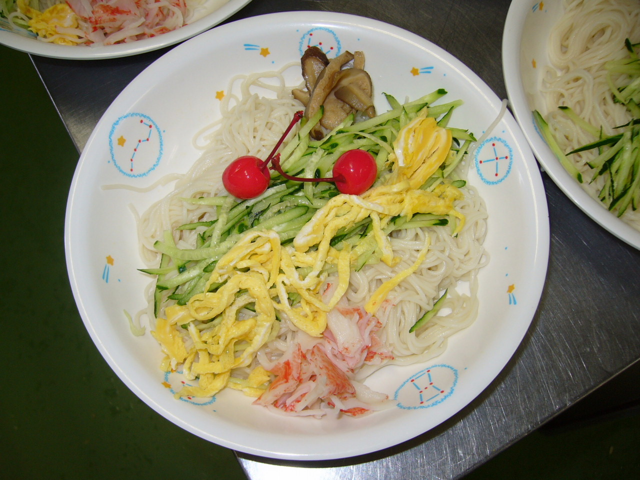 卵とキュウリが天の川、サクランボが織り姫と彦星の七夕そうめん(栄養士 談)です。